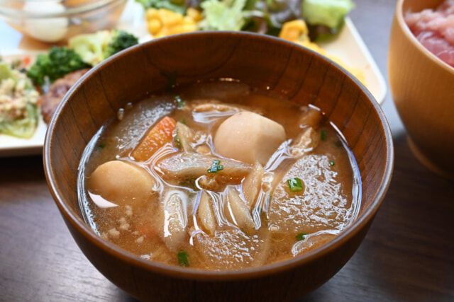 明治18年に創業した東京中野のあぶまた味噌。その「江戸甘味噌」を使ったお味噌汁も、試しておきたい味。江戸時代から庶民の間に伝わる甘味噌に、具材もたっぷり入ります。
