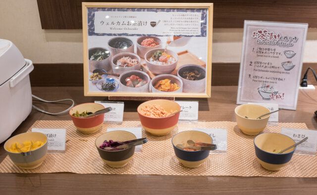 無料の夜食「お茶漬け」には、サケフレークや辛子高菜、柴漬けや梅干しなどのトッピングを用意。セルフで好みのお茶漬けを作れます。