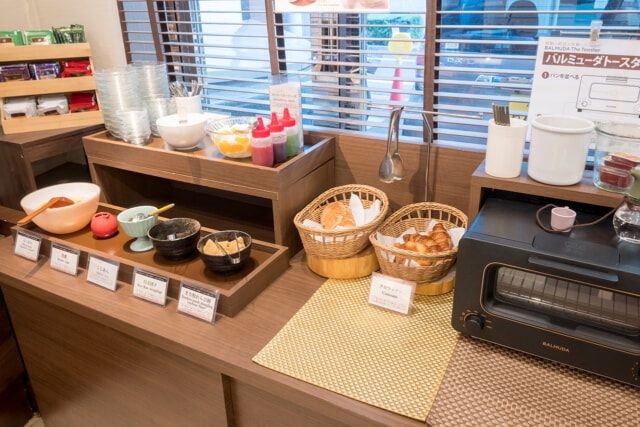 東京下町の味「あんみつ」もセルフで作れます。みつまめや白玉、あんこ、黒蜜、きな粉をまぶしたわらび餅などを用意。パンが美味しく焼けるバルミューダのトースターがあるのもうれしかったです。