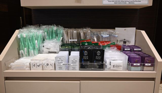 客室にはアメニティが用意されていないので、フロント横のアメニティバーより必要なものをピックアップ。メイク落としや乳液が用意されるほか、男性用化粧水もありました。