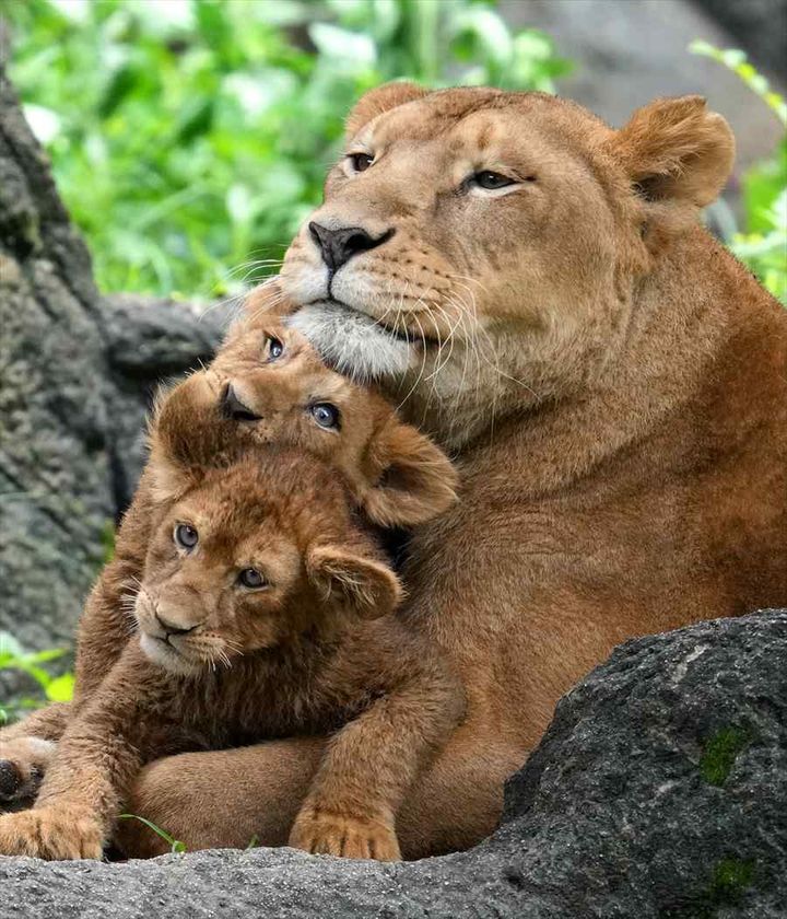 3. 割り込みしようとする子ライオン。きょうだいがママライオンにだっこされているところに頭をねじ込む姿が話題に!「見ていて幸せになれるショット」