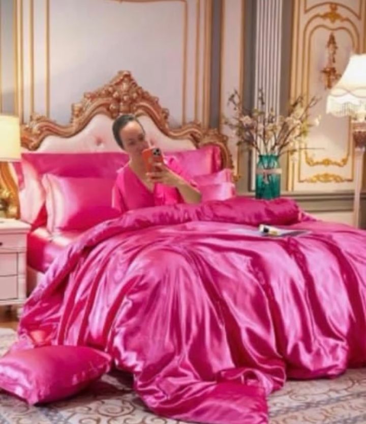 目を引くピンク色のベッドに横になるAdeleさんの画像を制作。