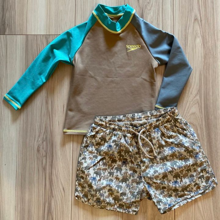 上から:speedo キッズユニセックスラッシュガード ¥5,940で購入、Konges Slojd スイムパンツ¥6,200で購入