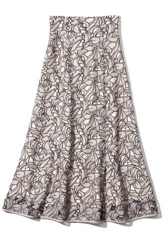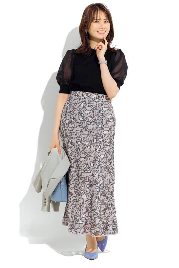 清潔感ある白ブラウスを合わせて、シックなグレースカートの華やかさをアップ。