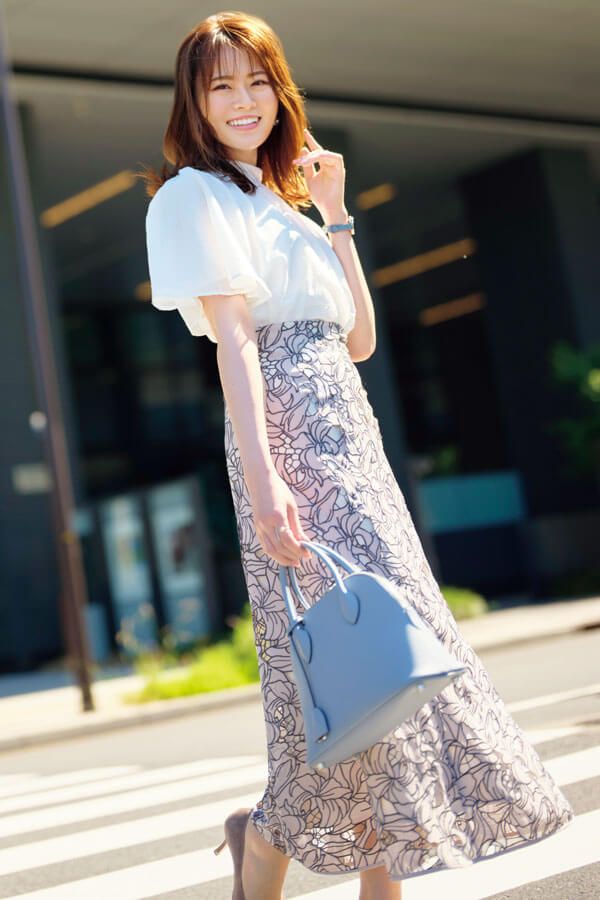 ブラウス¥11,000/Noëla スカート¥17,600/MERCURYDUO(MERCURYDUO ルミネエスト新宿店) ピアス¥3,300/プチタミ、リング¥17,600/masae(ともにロードス) 時計¥22,000/オリビア・バートン(エイチエムエスウォッチストア ルミネエスト新宿店) バッグ¥176,000/ボナベンチュラ
