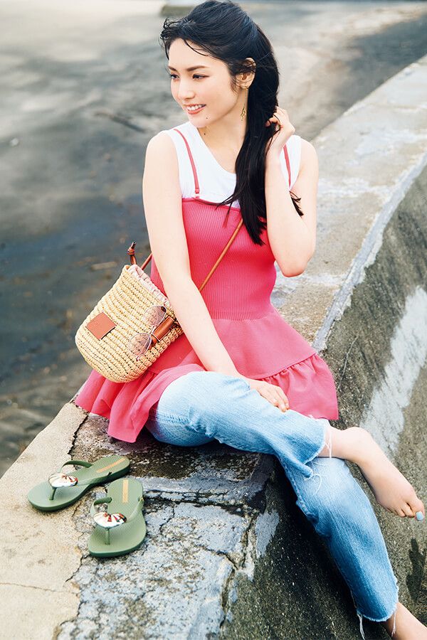 ビーチサンダル¥3,300/イパネマ(シードコーポレーション) カットソー¥8,800/ミューニック(アンタイトル) キャミソール¥14,960/SNIDEL パンツ¥20,500/NORMA JEANS BLU イヤリング¥6,820/イットアトリエ(14 SHOWROOM) サングラス¥18,700/ランバン オン ブルー(デリーゴジャパ ン) バッグ¥3,999/H&M(H&M カスタマーサービス)