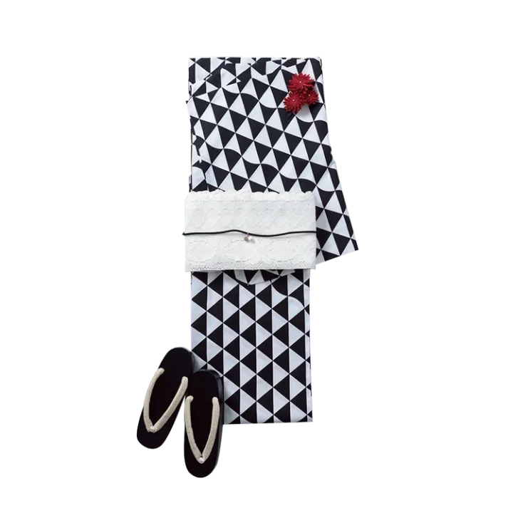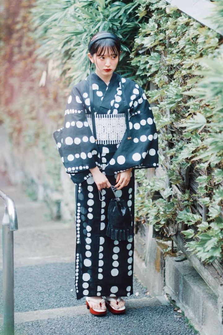 パッと目をひくモノトーンのドット柄がおしゃれ。赤がポイントの下駄や普段使いのカチューシャで、しゃれみを効かせる♡