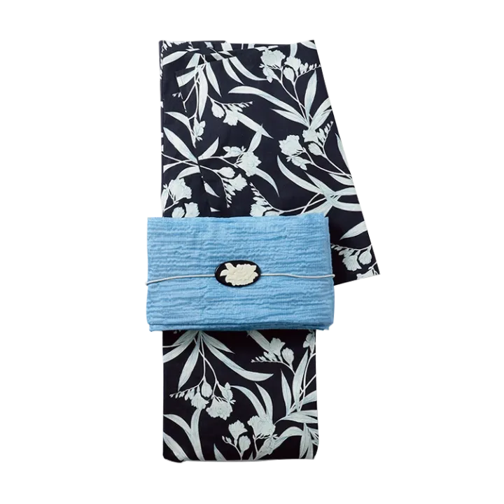 黒浴衣、帯、帯締めのセット 19,910円(7月上旬発売予定)/LILY BROWN 椿プレート帯留め 参考商品/三松