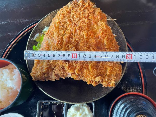 待つこと数分、運ばれてきたアジフライは「大」どころか『超特大』。 仲居さん協力の下、計測したところ20センチ。もしかすると「ほっけ?」と思うほどの大きさ。色々なところでメニューに書かれた「大アジ」を食してきたが、今回が横綱だ!と驚愕。