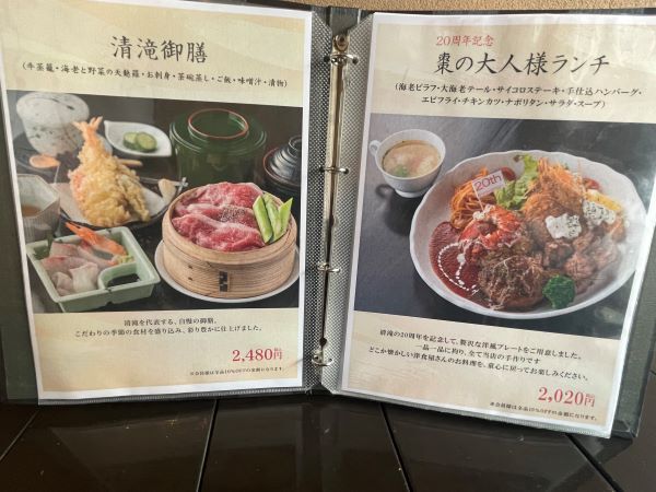 さて、メニューから 「何を食べようか?」 思案開始です。 6月4日から夏メニューに変更されたとのこと。卒業アルバム?のような立派なメニューには、大きな写真と説明が添えられていて、見ているだけでワクワクが止まらないぞ! 和食のフルコースとも言える「清滝御膳」は不動の一番人気、今回初登場の「棗の大人様ランチ」も連日売切れの大盛況とのこと。