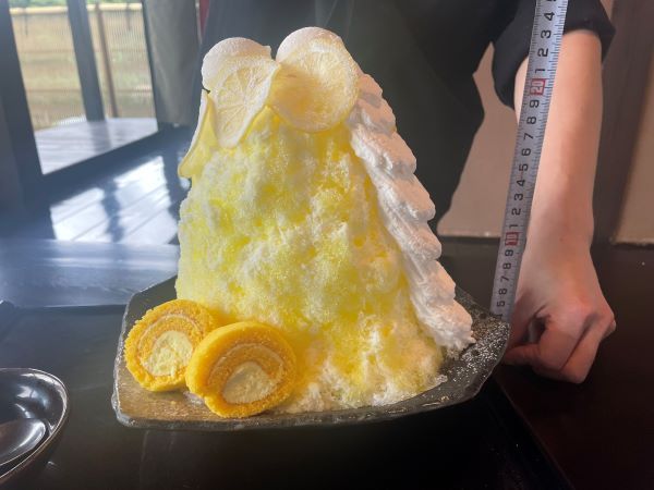 それで、運ばれてきたのがこれ。 余りの高さに再度、仲居さんに手伝ってもらい計測開始。標高22センチでしょうか、これ1人前です! メニュー記載のとおり、山頂付近にレモンのシロップ漬け、山頂にレモンアイス、山麓にレモンケーキが配置されたマウントアイスレモン。 さらに驚くことに、稜線に沿ってクリーム雪崩が発生した状態、食べ進めていくと氷の中にバニラアイスが隠されていました。 肝心の氷は 新雪のような口溶けの良いやわらかい氷 でした。