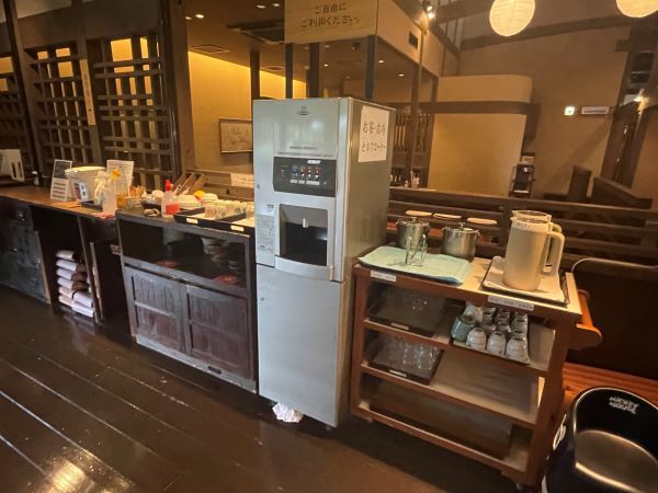 館内中央部にあるセルフコーナー。 お茶、冷水、おしぼりなどはお好みで持っていくスタイルです。