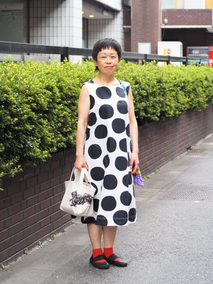 ドット柄のワンピースにあえて柄物のバッグを合わせる上級テクニックも、自由におしゃれを楽しむパーカーさんならでは。「イギリスの『ラッシュ』で購入したトートバッグと、友人から『とらや』のギフトをいただいたときについていたミニトートを合わせました」