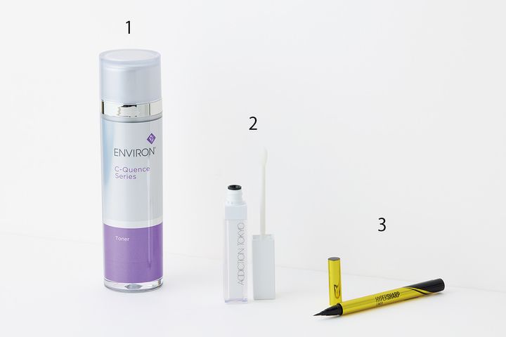 1「洗顔後すぐの肌に使うとその日の肌状態がわかる高機能ローション」エンビロン C-クエンストーナー130ml¥11,990(プロティア・ジャパン)2「ツヤが出すぎずさらっとした仕上がり。清涼感のあるつけ心地も好きです」アディクションリップセラム¥3,300(アディクション ビューティ)3「極細でラインの長さを調整しやすい」メイベリン ハイパーシャープ ライナー R BK-1 漆黒ブラック¥1,419(メイベリン ニューヨーク)
