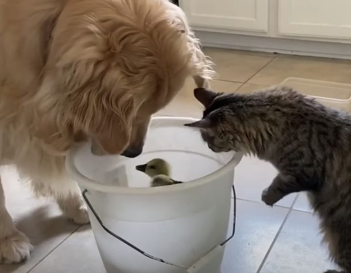 バケツの中に〇〇が♪ 興味津々で覗き込む猫と犬。