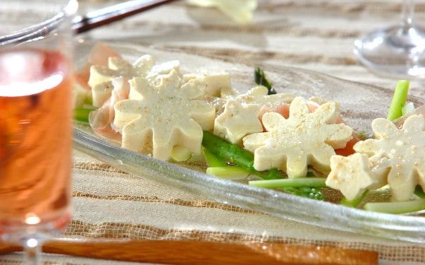 豆腐の白、生ハムのピンク、アスパラのグリーンと色合いが爽やかなマリネです。豆腐を水切りして、一晩マリネ液に漬けておくと、驚くほどチーズに似た食感に。豆腐は星型にくり抜き、七夕らしさをUPしましょう。