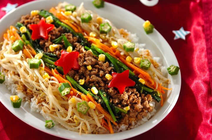 ビビンバの具を天の川ように盛りつけ、星型の野菜を飾れば、七夕の夜にぴったりなメニューに。栄養バランスも良く、しっかり食べたい方におすすめです。子どもは苦手な野菜克服にもなるかも!?