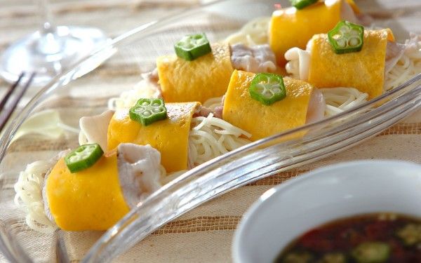 そうめんを薄焼き卵と豚しゃぶでくるりと巻き、つけ麺風にしていただきます。仕上げに星に見立てたオクラを飾り、七夕らしさをプラス。ひと口サイズで食べやすく、ごちそう感が増しますね。