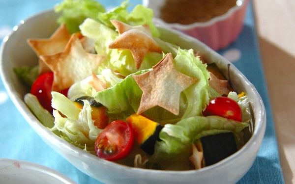 いつものサラダに星型チップスを散らして、手軽に七夕風にアレンジ。トースターでパリッと焼く餃子の皮が食感のアクセントに。餃子の皮の型抜きは力加減が難しいため、子どもが行う場合は、数枚重ねてあげましょう。