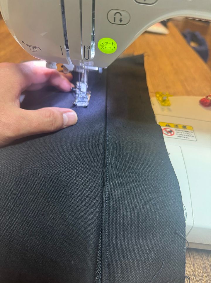 切り出しを終えたら、後はミシンです。説明通りにミシンをかけていきます。2mmとか無茶なこと言われますが、よくわからないので抑えの二又を目印にして縫ってました。