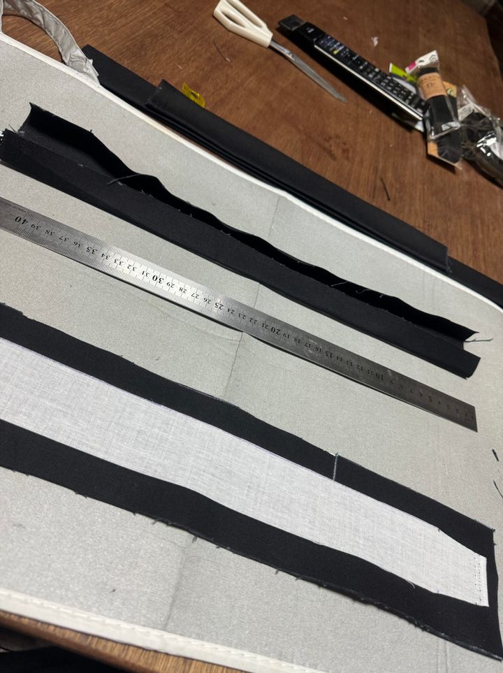 参考サイトを見ながら生地の切り出し。決まったサイズに切るだけです。これがまた面倒。とはいえ切らなきゃ進みません。全部切り出して、裏になる方になんの生地なのかメモしておきます。(これかなり大事ですよ!)
