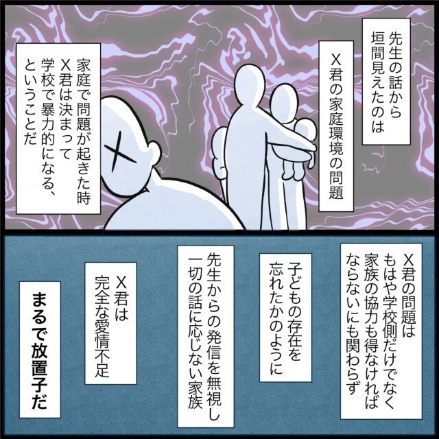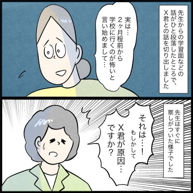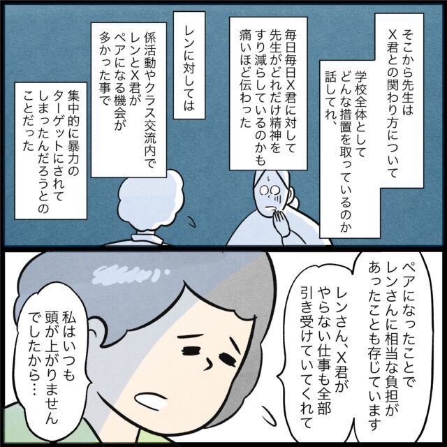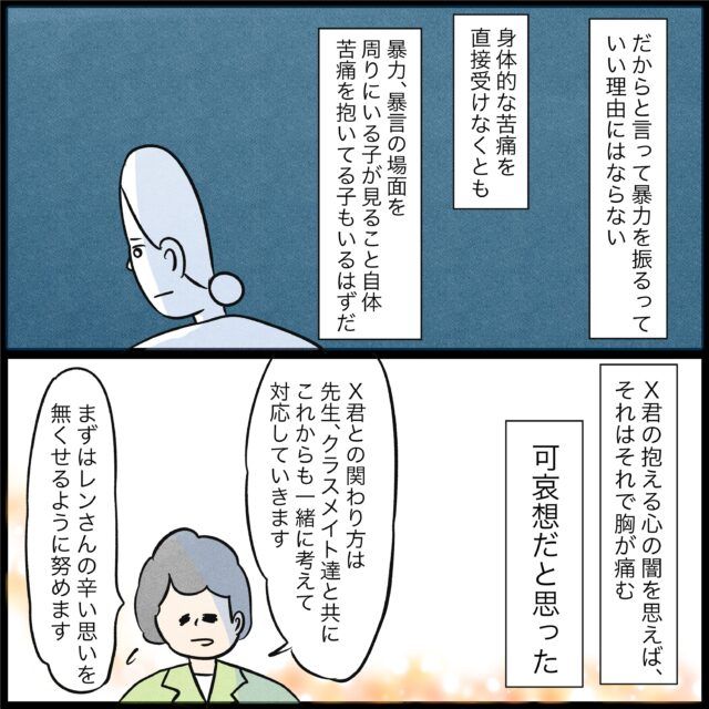 問題にしっかり向き合ってくれる先生で本当によかったです。暴力はもちろんいけないことですが、Xくんも辛い思いをしていたのですね・・・。