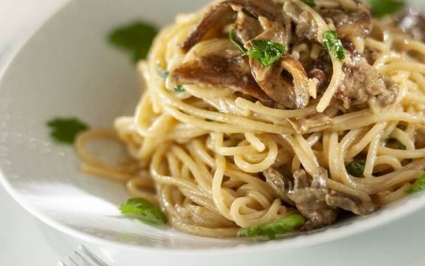 ポルチーニ茸を使ったクリームパスタ。ポルチーニを戻す際はえぐみが出ないよう、熱湯ではなく必ずぬるま湯を使いましょう。生クリームを使用した濃厚なソースがスパゲッティーにからんで美味です。赤ワインにもよく合います。