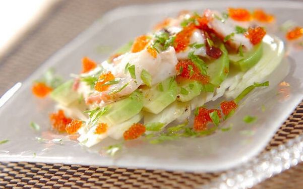 タコとアボカドをミルフィーユのように重ね合わせて盛り付けるとステキに! タコは薄くスライスすると繊細な口当たりになります。仕上げにトビッコを散りばめて彩りを添えましょう。