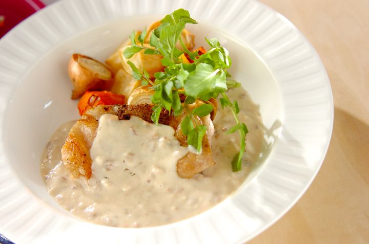 ソースはポルチーニとその戻し汁を加えて香り高く仕上げます。ソテーした鶏肉とオーブンでじっくりと焼いた野菜にソースがよく合います。クレソンを添えれば、レストラン級の豪華な一皿に。