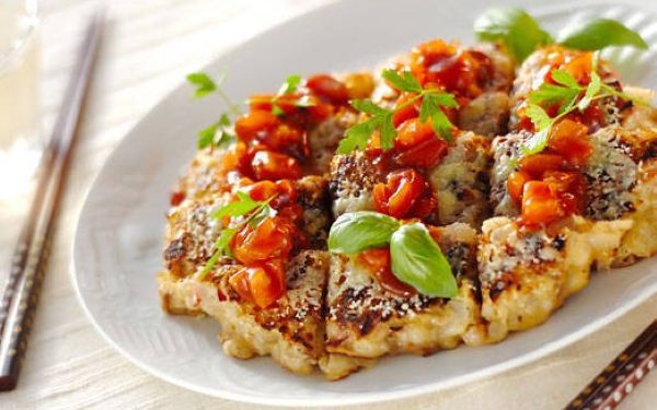 キノコの風味豊かなイタリアン風のお好み焼きです。ソースには皮をむいたトマトを使用します。プチプチとした押し麦の食感でおいしさがさらにアップ! 衣を作るときに、ポルチーニの戻し汁が大事な調味料になりますので、残すのを忘れずに。