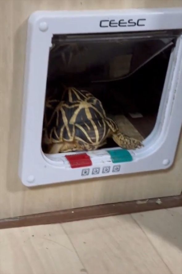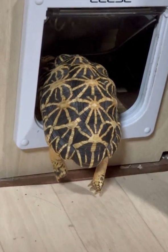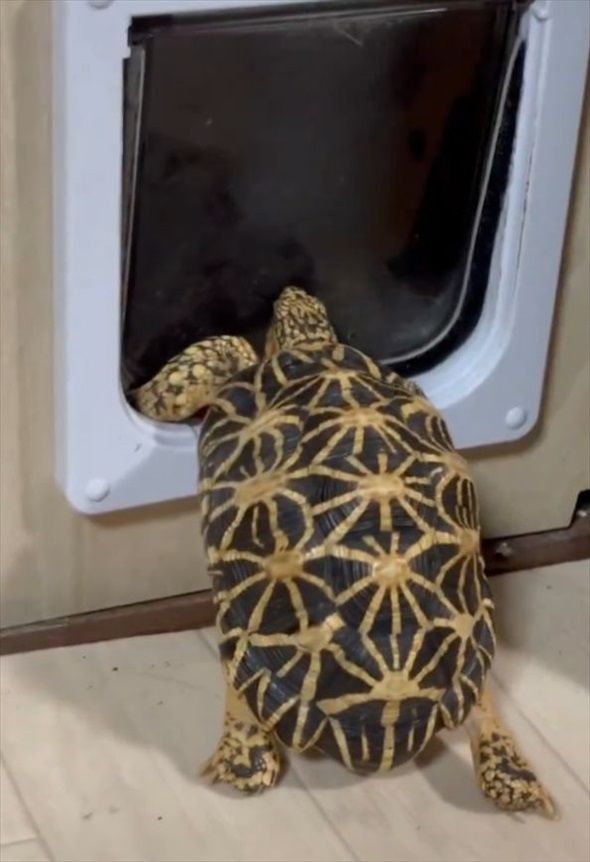 そこには、ペットドアをくぐり隣の部屋まで移動しようとしている、インドホシガメの『ホシ』くんの姿がありました。