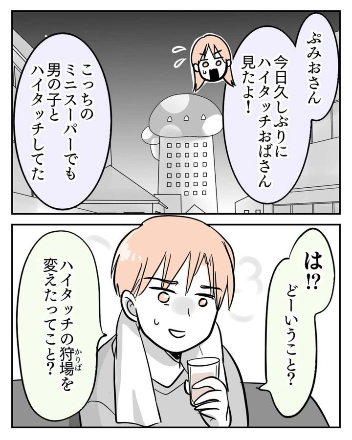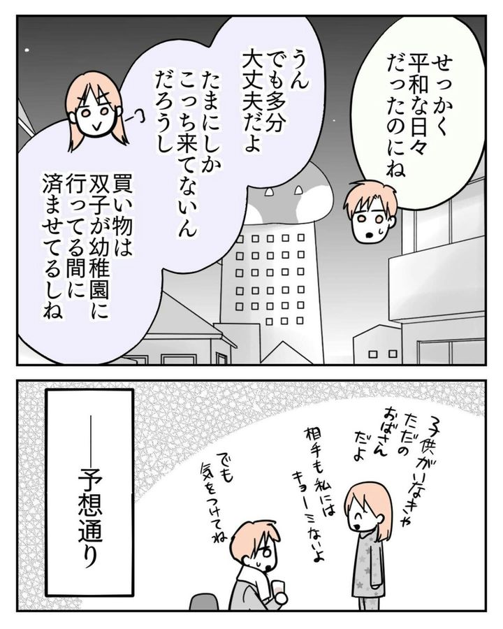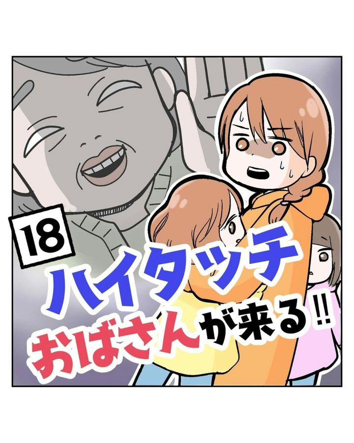 このお話は、著者・サヤ山 サヤ(@saya_twins1125)さんが2歳の双子・ポンちゃんとコンちゃんの子育てをしていたとき、勝手に子どもに触ろうとする女性と遭遇した体験談が描かれています。その後、サヤさん一家は引っ越しをし、生活圏が変わったため、「ハイタッチおばさん」と遭遇することはもうないだろうと思っていました。ところが、近所の小さなスーパーで女性を見かけます…。『ハイタッチおばさんが来る‼』第18話をごらんください。