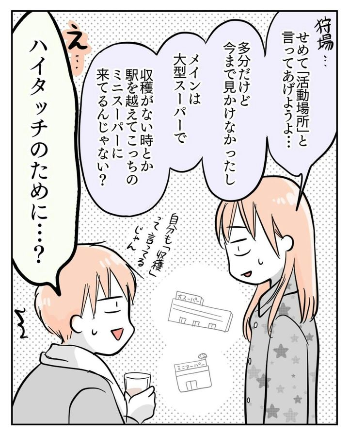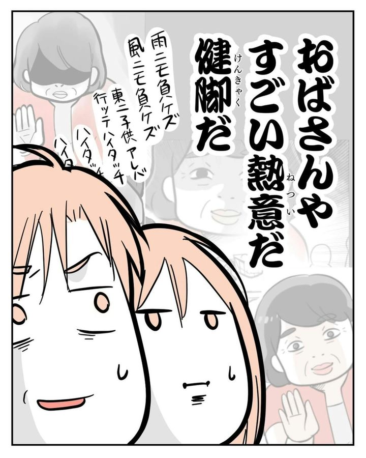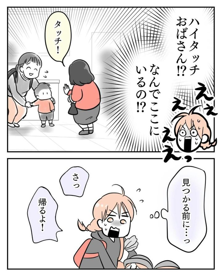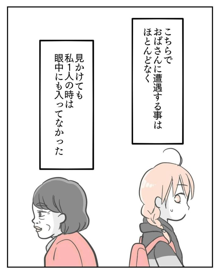 思わず一句読んでしまうほど、夫婦で「ハイタッチおばさん」の熱意に圧倒されました。ですが、サヤさんの予想通り、1人で買い物をしているときに遭遇しても、ハイタッチおばさんはサヤさんには気づいていません。
