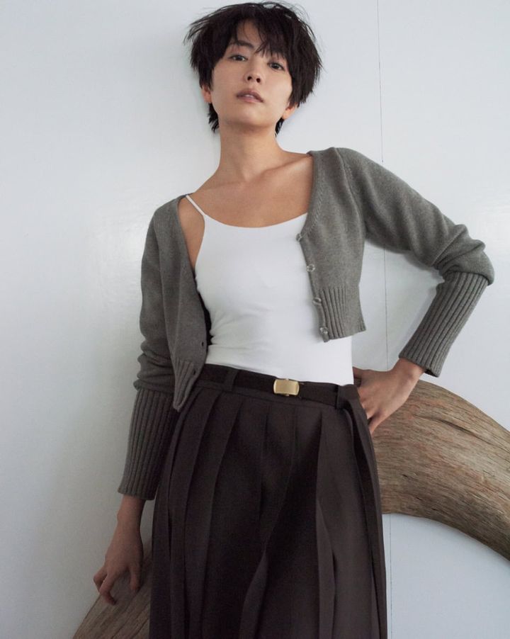 キャミソールボディ¥9,790(ガブリエル ペコ)、カーディガン¥24,200(UKI UKI)、ベルト付きプリーツスカート¥67,100(エブール/リトルリーグ)