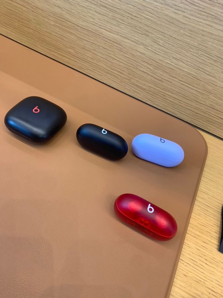 写真左上に置いた「Beats Fit Pro」と比較すると半分くらい。カラバリはマットブラック、ストームグレイ、アークティックパープル、トランスペアレントレッドの4色。私はレッドを購入。アップルストアにて¥12,800(税込)なり。