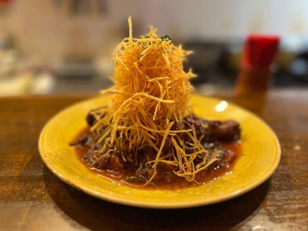 仕上げはチキンと積み上げられたポテト!重めの赤ワインと共に。