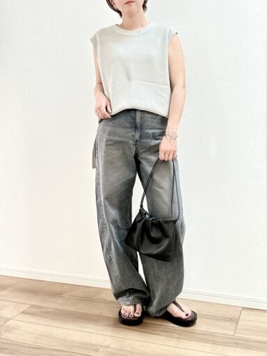 デニムは丸みがかったシルエットが旬なバレルレッグデニムを。そこに優しげな印象のベージュのフレンチスリーブセーターをあわせれば、女らしさをプラスできます。トップスは前後差のあるデザインなので、フロントインしやすく、簡単にバランスを整えられるのも嬉しいポイントです。