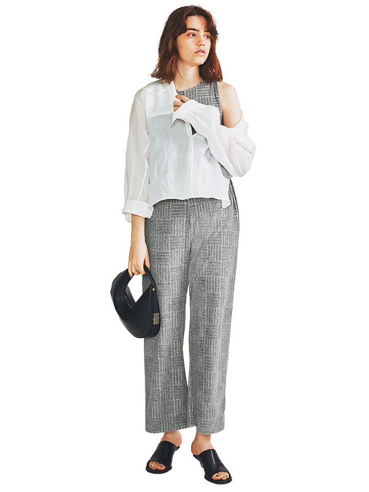 夏に着やすいパイル素材をジャガード織で仕立て、柄のようにも見える模様をつけたオールインワン。ふかふかとした立体感が生まれ、中間色のグレーでも間のびしない。ぶかっともぴったりもしないシルエットに加え、詰まり気味の首元がゆるさのなかにも必要なきちんとした印象をキープ。