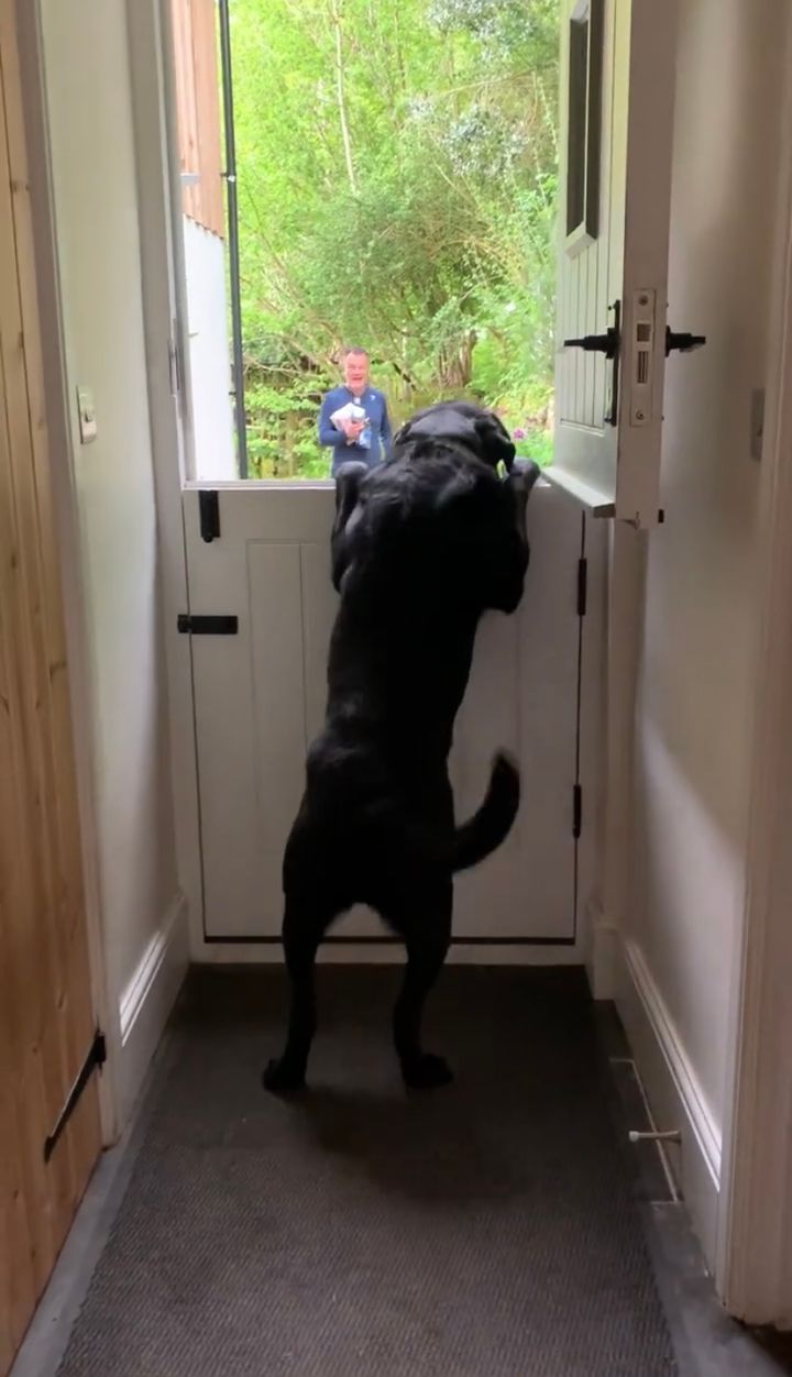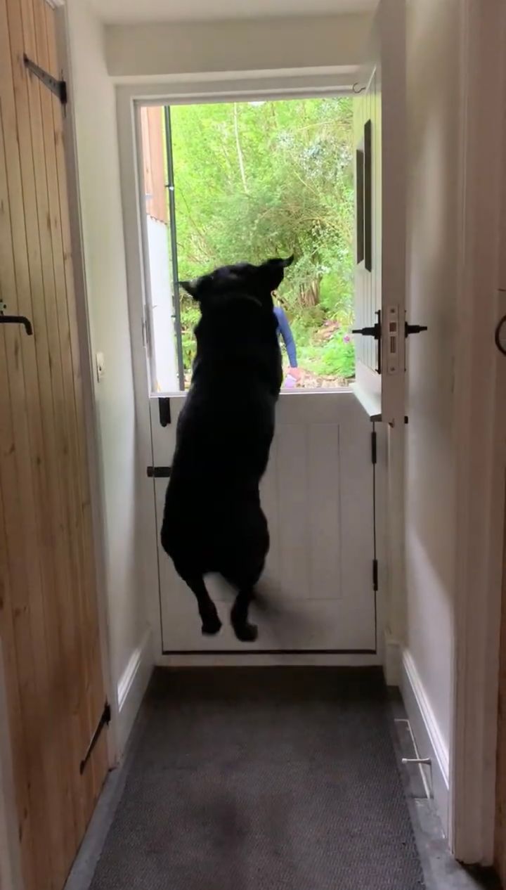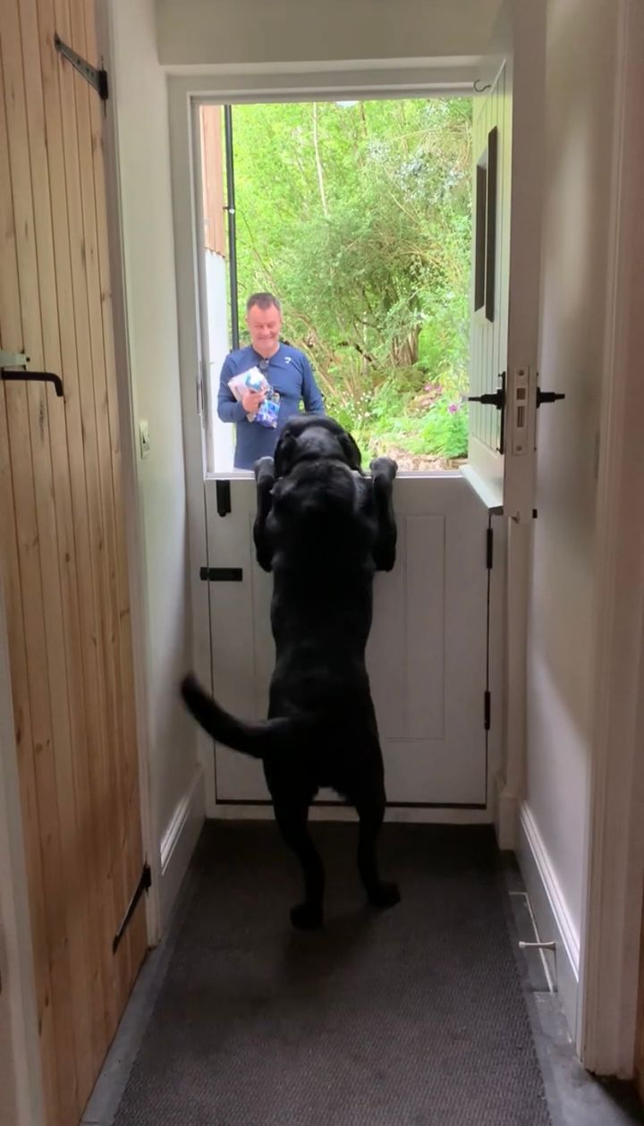 ドアから身を乗り出して尻尾を振っているのは、ラブラドールレトリバーの『アーニー』。 どうやらパパさんが帰ってきたことに気付いて、大喜びしているようです。
