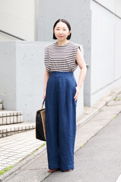 「ノースリーブのプルオーバーはロワズィールの定番のもの。立体感があって大人っぽく、腕がほっそり華奢見えします。サイドからインナーが見えづらいところや、落ち着いた色合いのボーダーもお気に入り。パンツもアデュートリステスの定番パンツ。今年はシルエットがよりすっきりアップデートされていて、はきやすくなっています。リネン100%で風通しがよく涼しいので暑い時期にも最適です」