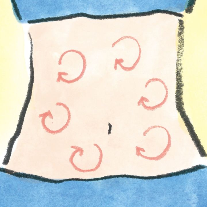 お腹が5mm程度へこむくらいの力加減で、小さい円を描きながら位置をずらしておへそまわりをほぐしていく。硬いところや冷たいところ、柔らかいところ、温かいところがないか探しながら、違和感があるところは念入りに行う。これを時計回りに3周繰り返す。