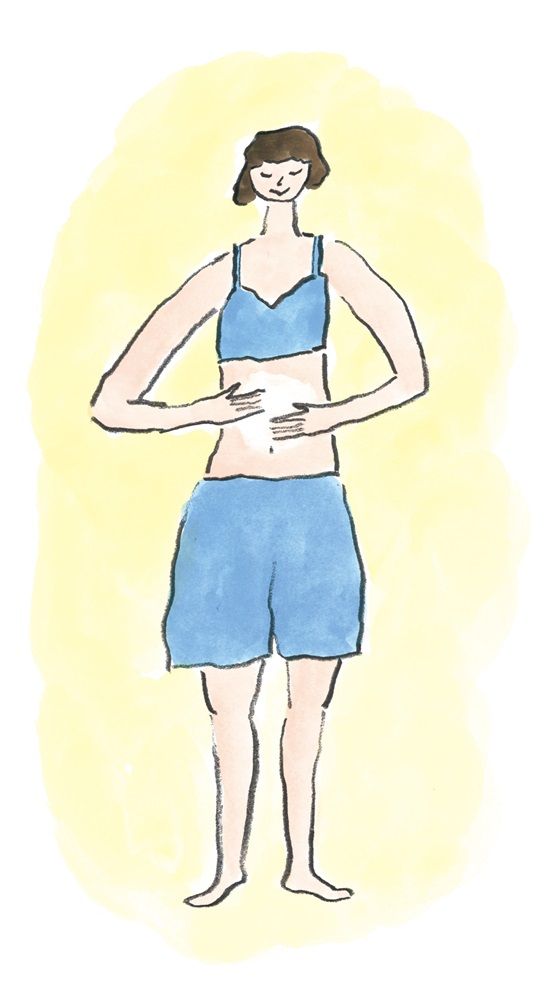 手のひらやデコルテよりもお腹がひんやりしていたら、プレッシャーにさらされて頑張りすぎている証拠! 交感神経が過剰に働いてしまい胃腸に負担がかかっている可能性が。