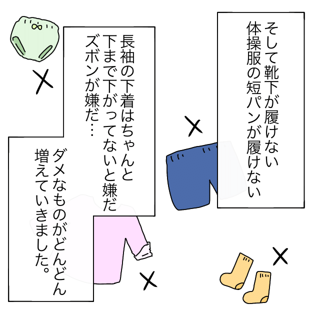 当時、1枚も嫌じゃないパンツがなかったこともあり、「着替えることは何度も嫌な思いをすること」だと思ってしまったのかもしれません。