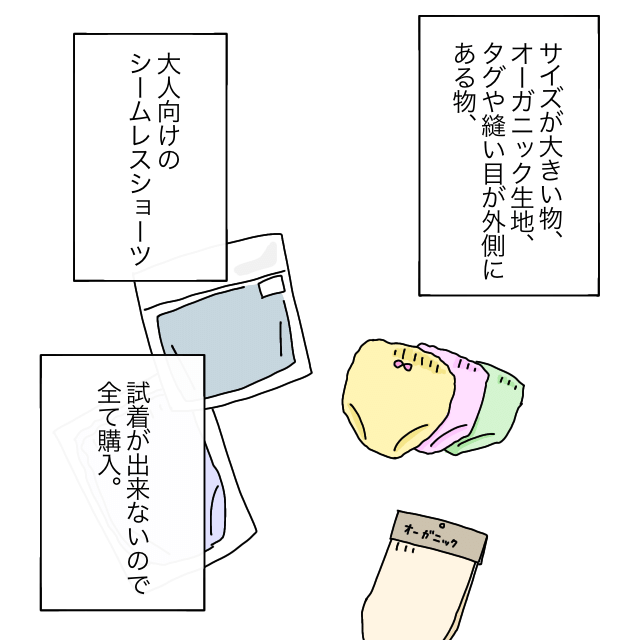 サイズが大きい物、オーガニック生地、タグや縫い目が外側にある物と、子ども用だけでなく、大人用のシームレスショーツまで・・