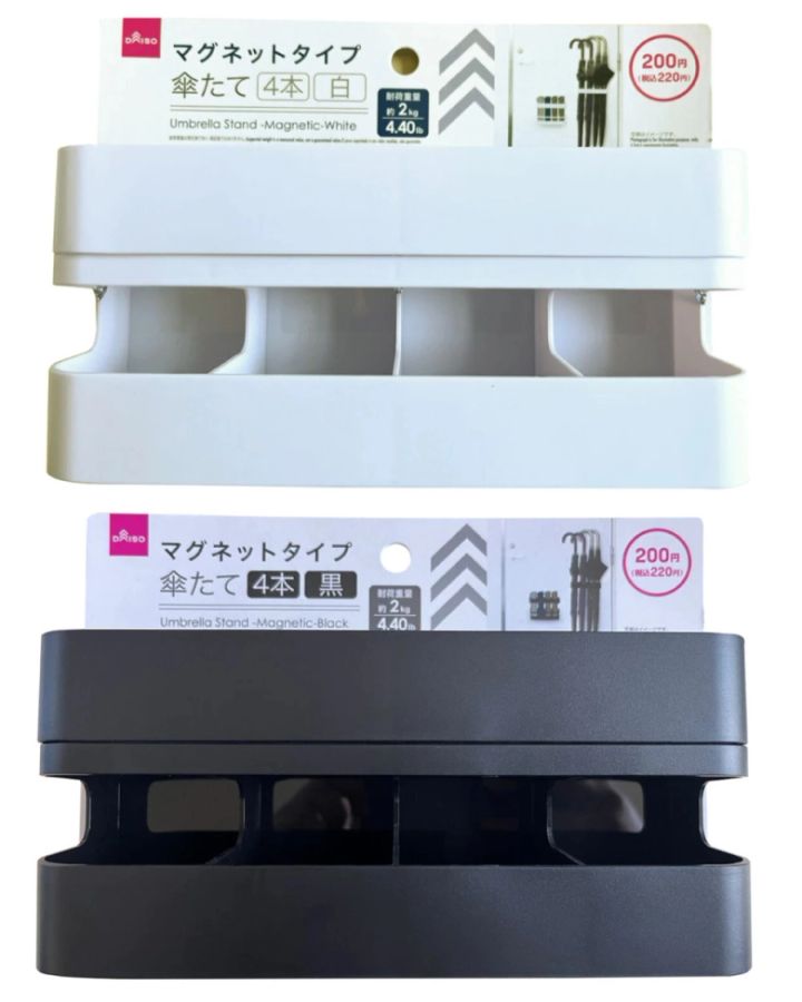 「傘立て(4本マグネットタイプ)」は、最大4本収納できるタイプ。200円商品です。こちらも白と黒の2色展開。