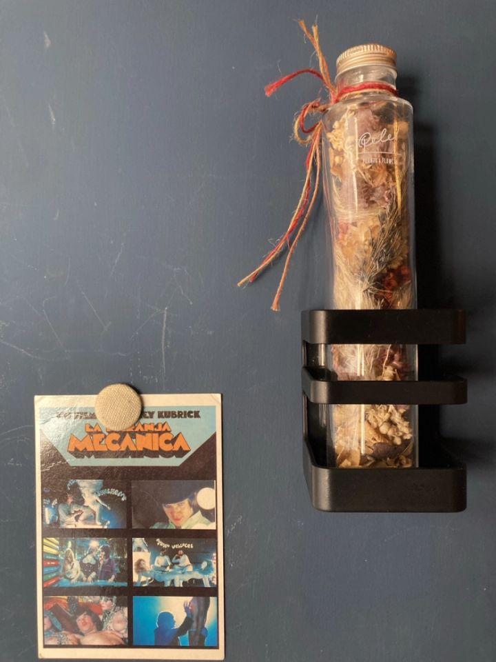 こちらはマグネット傘立てにドライフラワーの入った小瓶を飾ったアイデア。サイズ感もぴったりフィット。まさかこれが傘立てだとはだれも思わないでしょう。こんなふうに、マグネットタイプの壁面インテリアにも役立ちそうですね☆