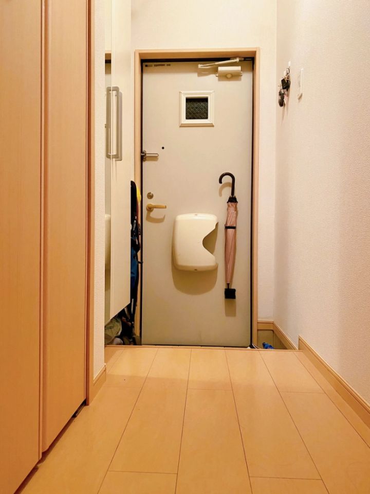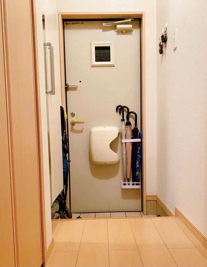 こちらの写真のように、玄関の扉にくっつけて傘を収納できます。「玄関に立てかけた傘が倒れる…」そんなストレスもなくなります。