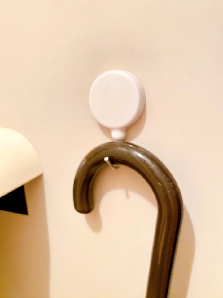 玄関扉にくっつけてみると、写真のように傘がしっかり挟めます!耐荷重が500g。マグネットではなく粘着テープなので好みはわかれるかもしれません。柄の太い傘は挟めないこともあるので注意してください。この1つのパーツで傘立てとして機能するので、玄関をよりスッキリと見せるには良いですね。