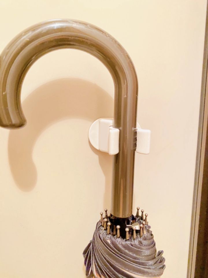 本来、棒状の掃除用具を挟むために販売されている「ワンキャッチ」。傘の柄を挟めば、傘立てとしても代用できます。