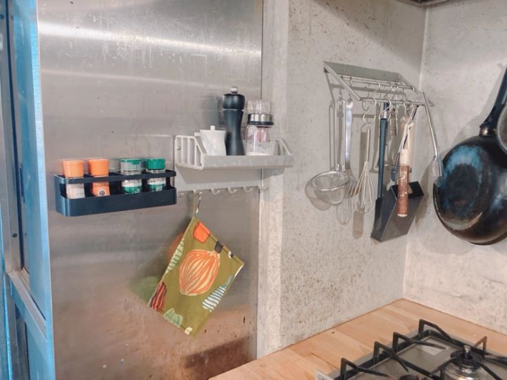 スパイスもぴったりと入る4本タイプの傘立て。こうやって並ぶと、インテリアのようにも見えてきます。目線の高さにあると取りやすさもアップ。料理するのも楽しくなるかも♡